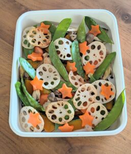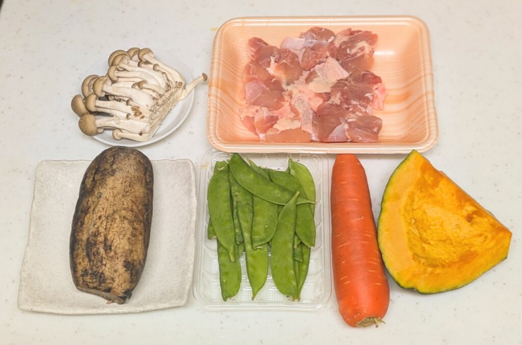1. 下準備: 根菜類(かぼちゃ、さつまいも、人参、れんこん)を一口大に切ります。硬い野菜は、あらかじめ軽く蒸しておきます