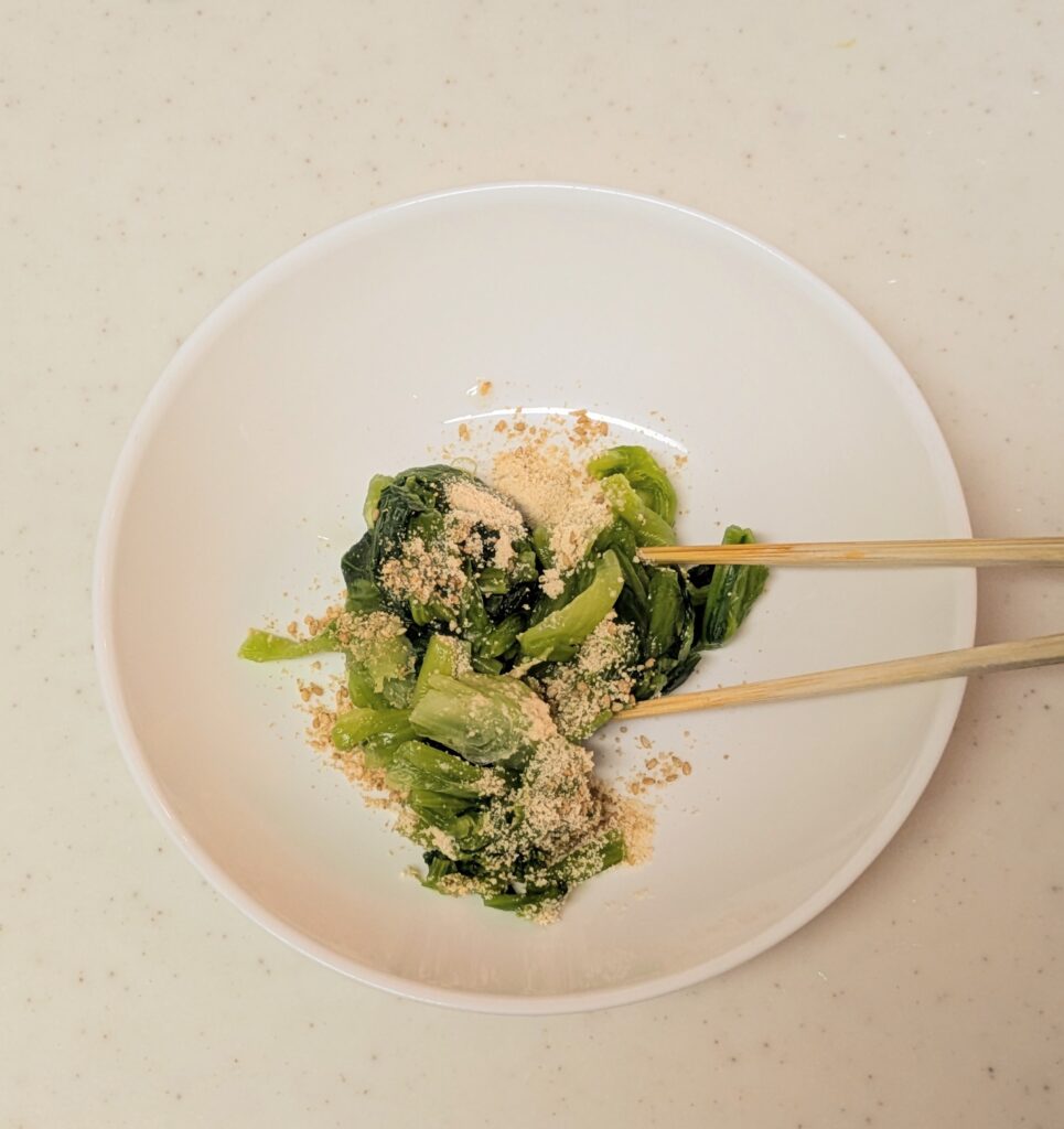 ③ 小松菜は洗って3cm程度に切り、レンジで2~3分加熱します。