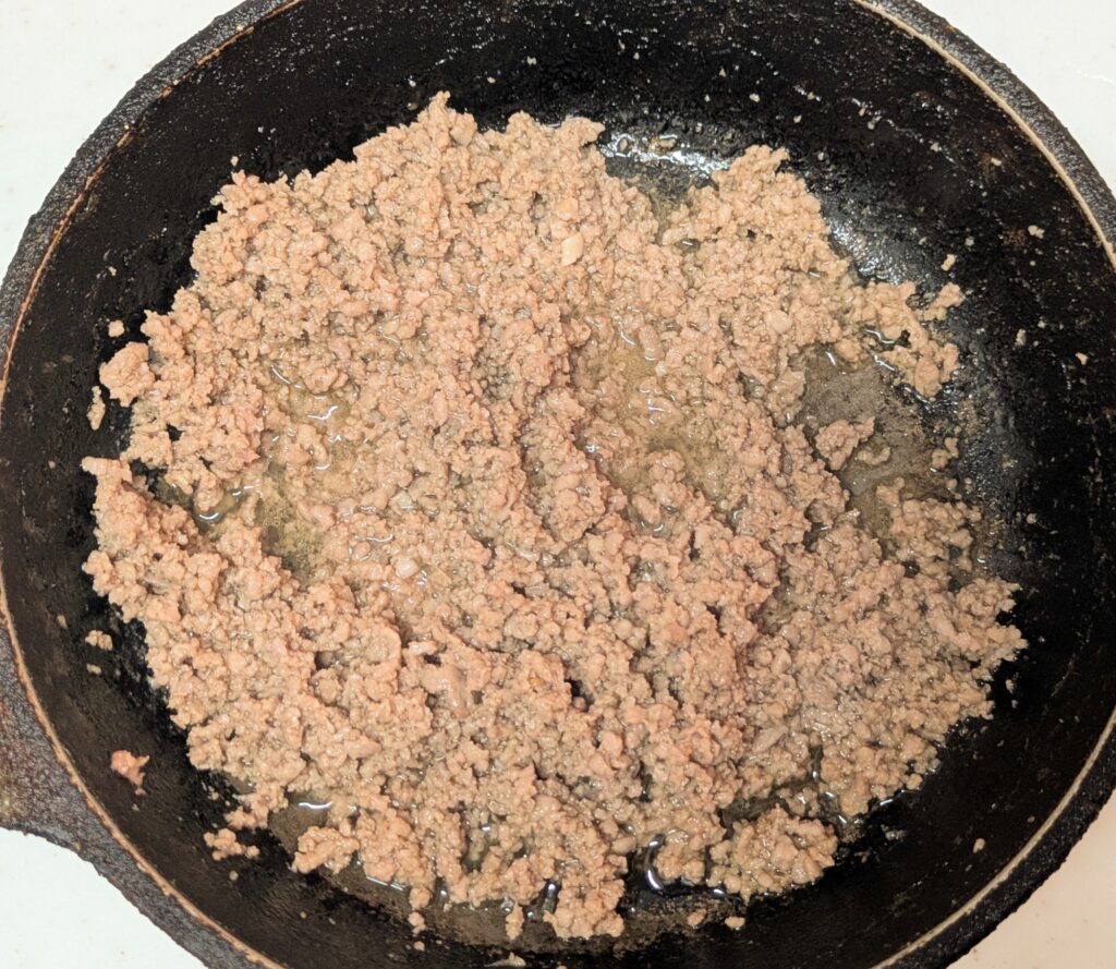 ⑤ 合い挽きミンチをフライパンで色が変わるまで炒め、焼き肉のたれで味付けをします。