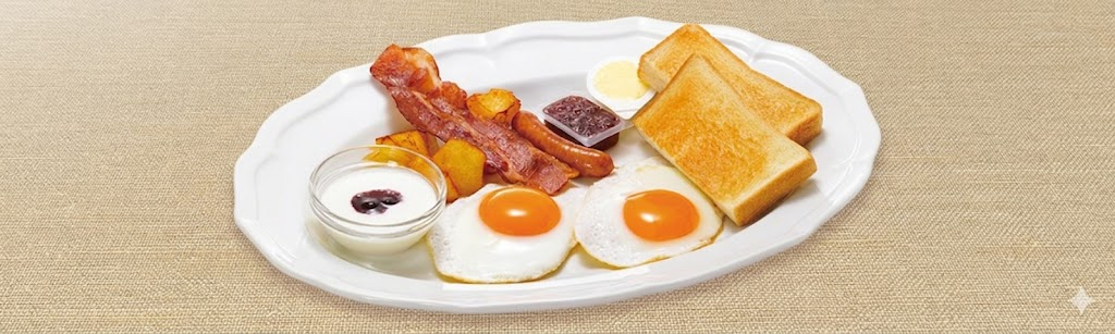内容はトースト、目玉焼き、ウインナー、ベーコン、ポテト、ヨーグルトと